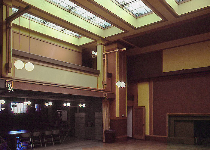 中央ミーティング・ルーム。 右側に 暖炉、左側上下階は 教室(休日なので 真っ暗)。