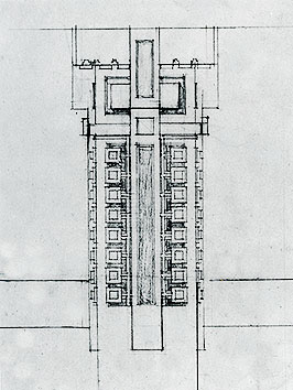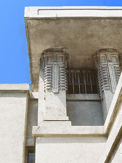 (左)ユニティ・テンプルの、外壁の小柱の装飾。 これが発展して、バーンズドール邸の ホリホック装飾となる。 (右)コンクリート柱の装飾の、ライトのスケッチ (From "Unity Temple" by Robert McCarter, Phaidon, 1997)