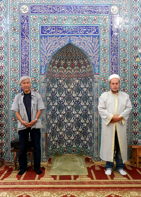 サハト・モスクの インテリア、タルゴヴィシュテ 華やかにタイルで飾られたミフラーブの前で、イマームとともに。 ミフラーブに くいこむように一人用の礼拝カーペットが置かれているのは、 普段 イマームが ここで礼拝しているのだろう。