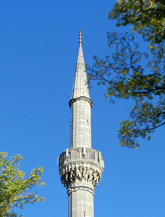 シューメンのトンブル・モスク、ミナレット オスマン型の鋭く尖った石造ミナレットで、バルコニーの下部は繊細なムカルナスが彫刻されている。 ブルガリアで最も背が高く(40メートル)、完成度の高いミナレット。