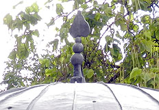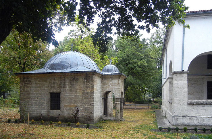ヴィディンの オスマン・パズヴァントール・モスク(右)と 図書室(左) ドームの頂部に、通常の三日月ではなく、逆ハート形が取り付けられている(ミナレットの頂部にも)。 モスクの設立者で、スルタンに反旗を翻した オスマン・パスヴァントールの シンボルだという。 窓の上部はアーチではなく、まぐさ石。