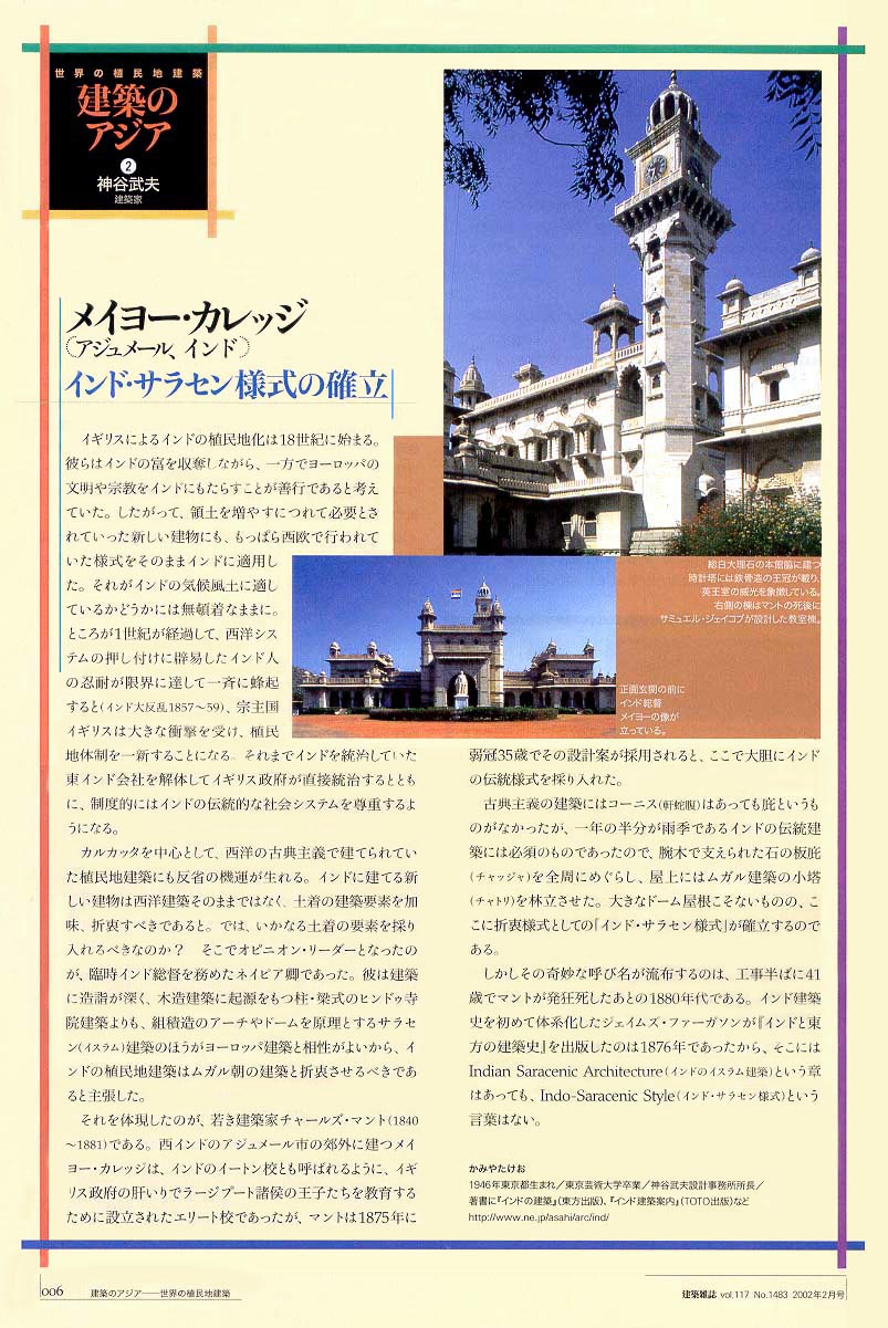 メイヨー・カレッジ(アジュメール、インド) イギリスによるインドの植民地化は 18世紀に始まる。 彼らはインドの富を収奪しながら、一方で ヨーロッパの文明や宗教をインドにもたらすことが 善行であると考えていた。したがって、領土を増やすにつれて必要とされていった新しい建物にも、もっぱら西欧で行われていた様式を そのままインドに適用した。 それが インドの気候風土に適しているかどうかには無頓着なままに。 ところが1世紀が経過して、西洋システムの押し付けに辟易した インド人の忍耐が限界に達して 一斉に蜂起すると(インド大反乱 1857〜59)、宗主国イギリスは 大きな衝撃を受け、植民地体制を一新することになる。 それまでインドを統治していた東インド会社を解体してイギリス政府が直接統治するとともに、制度的には インドの伝統的な社会システムを尊重するようになる。 カルカッタを中心として 西洋の古典主義で建てられていた植民地建築にも 反省の機運が生れる。インドに建てる新しい建物は 西洋建築そのままではなく、土着の建築要素を加味、折衷すべきであると。 では、いかなる土着の要素を とりいれるべきなのか? そこでオピニオン・リーダーとなったのが、臨時インド総督を務めたネイピア卿であった。 彼は建築に造詣が深く、木造建築に起源をもつ 柱・梁式のヒンドゥ寺院建築よりも、組積造のアーチやドームを原理とする サラセン(イスラム)建築のほうが ヨーロッパ建築と相性がよいから、インドの植民地建築は ムガル朝の建築と折衷させるべきである と主張した。